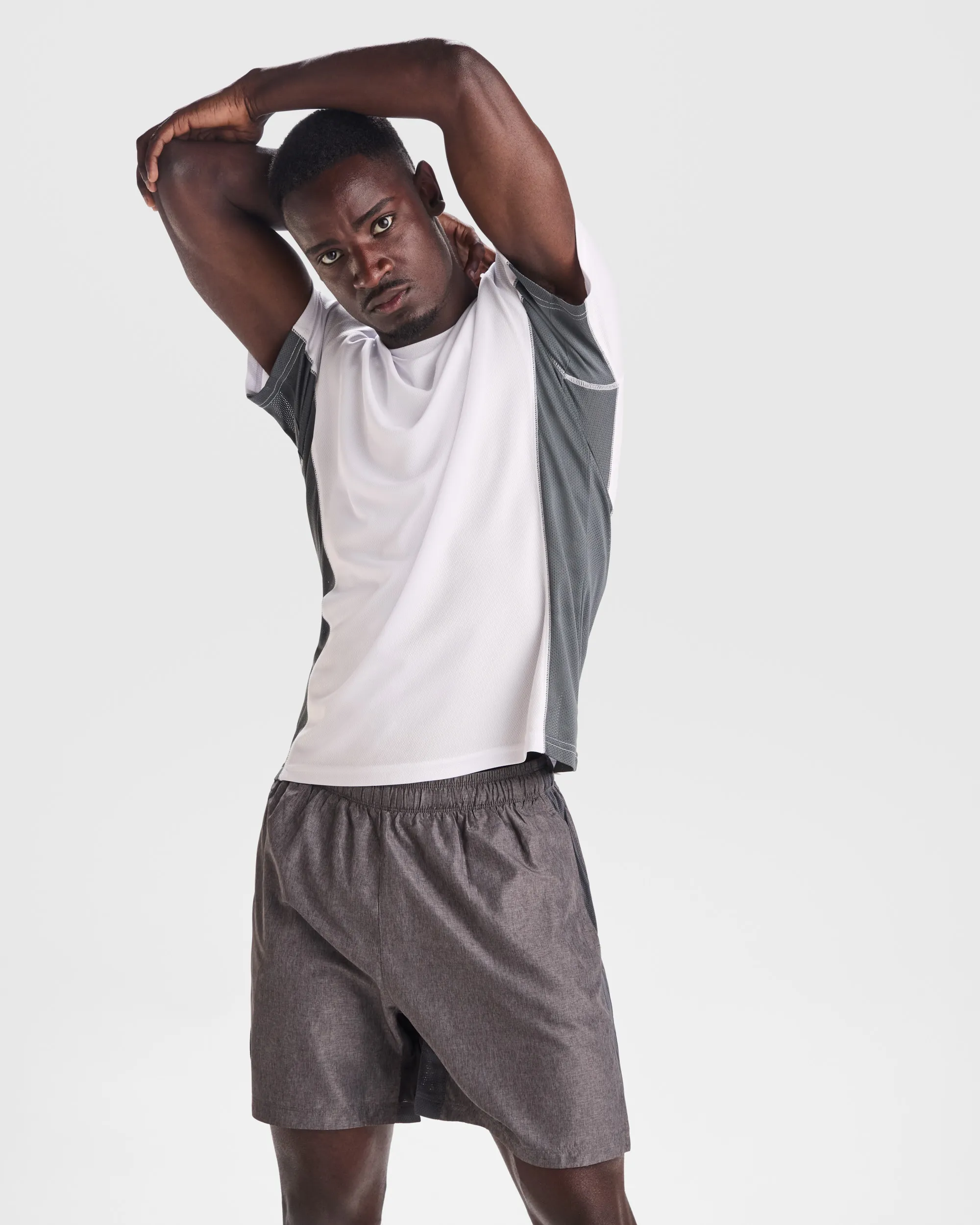 Camiseta técnica manga ranglán transpirable bicolor. Paneles laterales en tejido microperforado. Cuello redondo y cubrecosturas del mismo tejido al tono