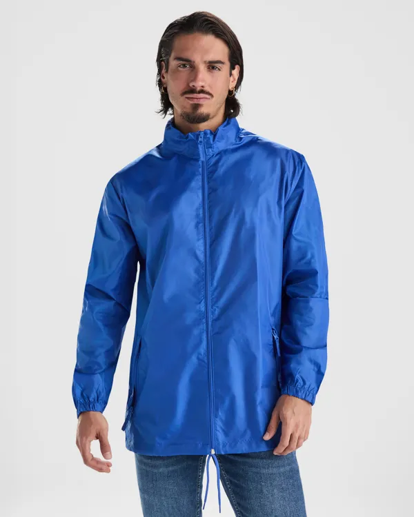 Chubasquero con cuello alto y capucha extraíble con cordón ajustable. Repelente al agua. Resistente al viento. Cremallera frontal al tono. Bolsillos laterales con cremallera cubiertos por solapa del mismo tejido. Puños elásticos. Bajo con cordón interno ajustable. Goma en bolsillo para su plegado.